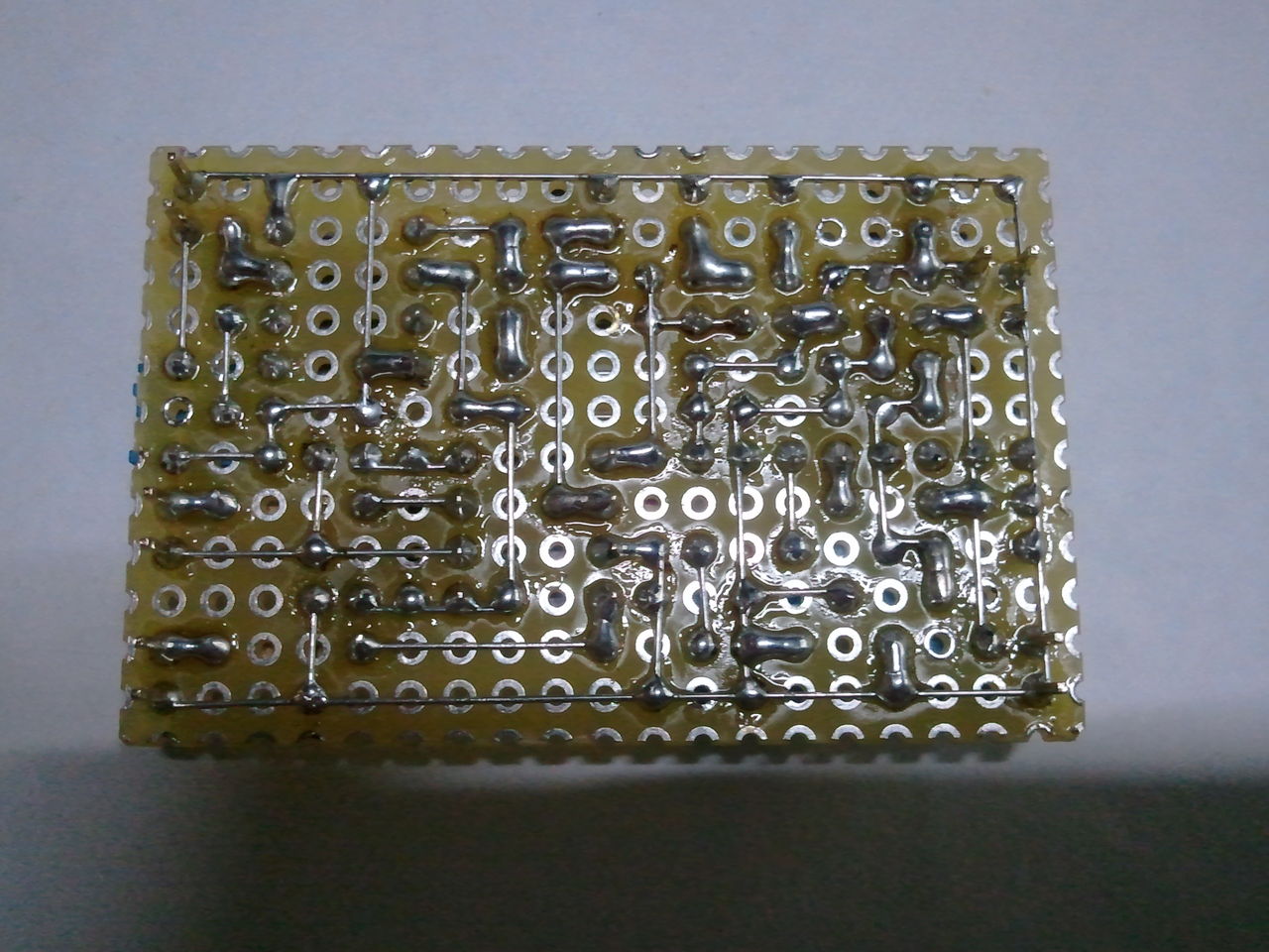 えぇみなまで言わずとも分かります。 ACラインが細すぎます近すぎます危険です。でもユニバーサル基板ではどうしようもないです。 本来ならばこういう高電圧大電流が流れるところはプリント基板で組むべきですが、あまりにも手間がかかりすぎるのです。