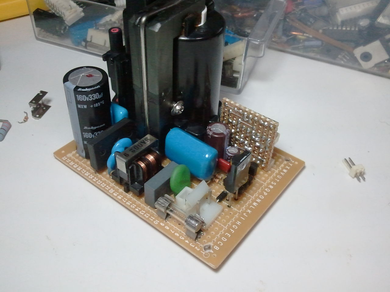 もういきなり作っちゃいます。今回はハーフブリッジにするため整流回路は倍電圧整流回路としました。ですがいきなり282Vはハードル高いので、通常は普通の全波整流回路で141V出力、ターミナルをショートさせると倍電圧整流回路で282V出力になります。 そして発振回路用のスイッチング電源回路も同居させました。 またこの電源基板も流用できるように全てターミナルで接続するようにしてあります。 他細かな変更点は、電源を切ったあとに触っても大丈夫なようにセメント抵抗を追加したこと、それと何気にZNRが2個追加されています。